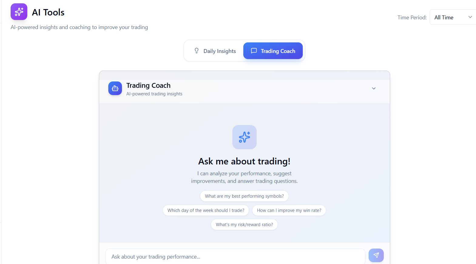 The AI analyzes your logged trades and stats to generate daily insights, highlight patterns, and suggest ways to improve. You can also chat with the Trading Coach to ask questions about your performance, risk, win rate, holding periods, and more.
